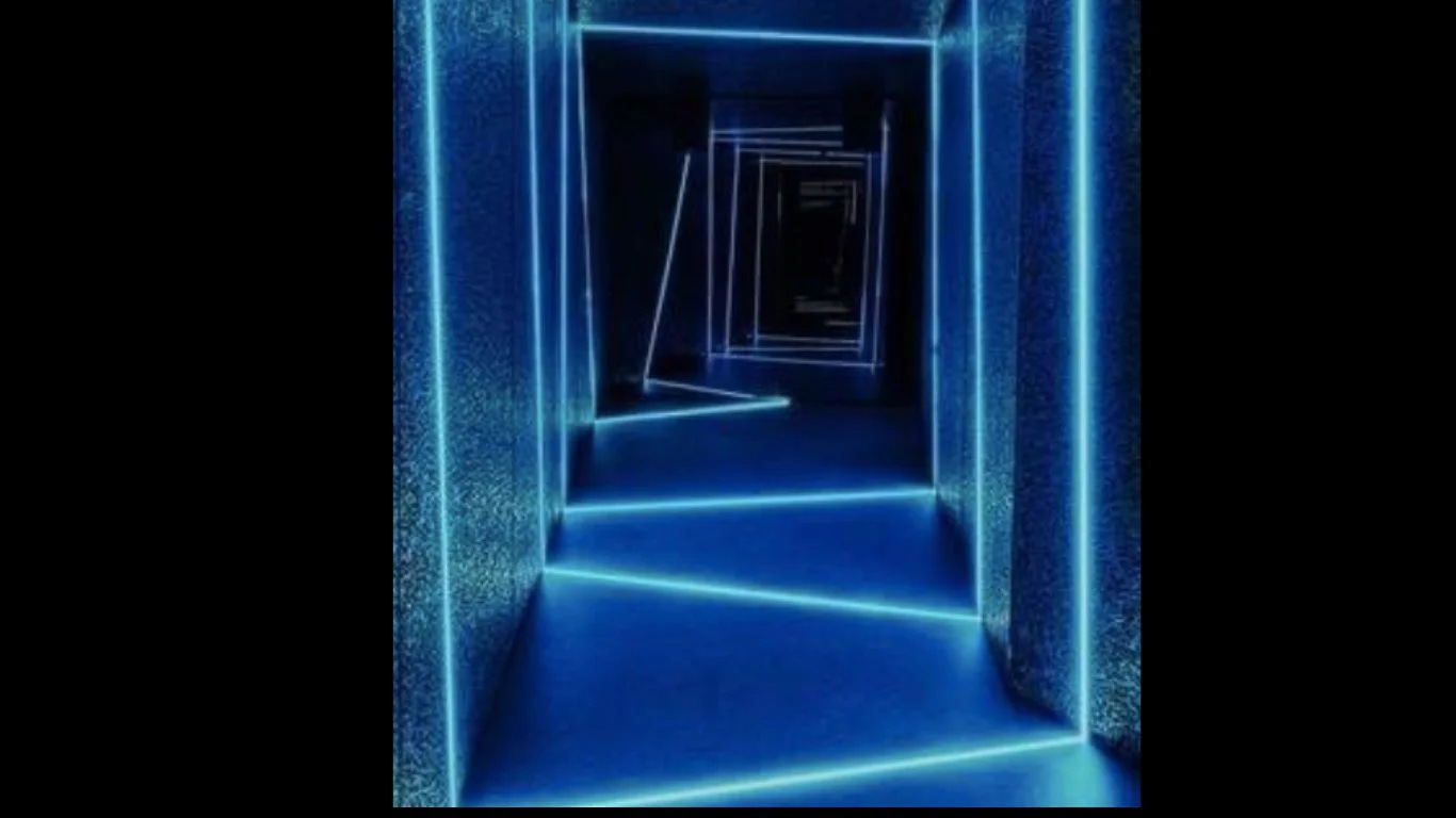 Hallway: Everything leans a few degrees off plumb. Blue neon light. No known source. Undetermined distance.